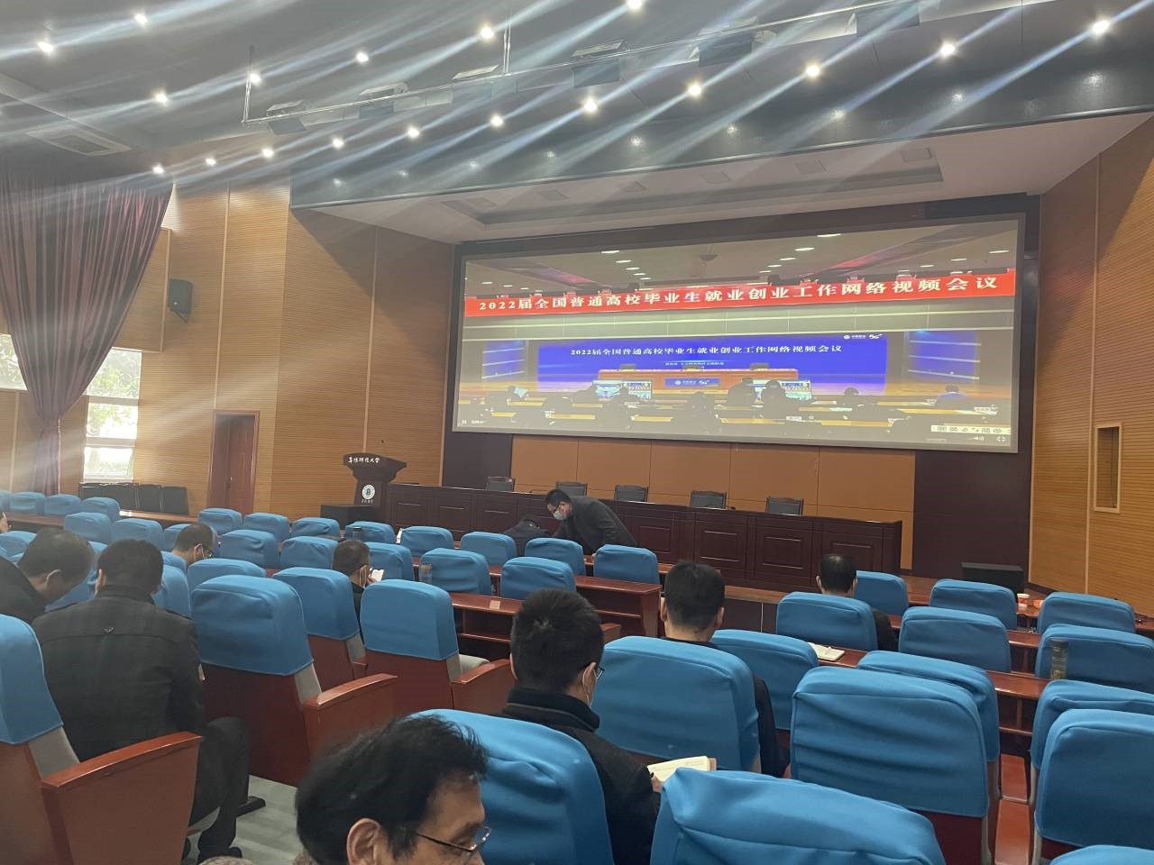 11月19日,我校在西湖校区F楼报告厅组织收看教育部、人力资源社会保障部2022届全国普通高校毕业生就业创业工作网络视频会议,我院党委书记钱守云、党委副书记李阳、就业指导员胡五木以及2022届毕业班辅导员李庆瑞参加观看。