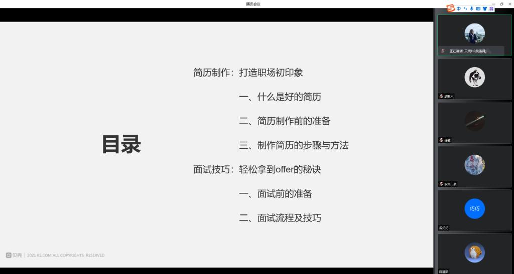 为了帮助大学生解决求职过程中的疑难问题、熟知求职面试流程、提高求职简历制作技能以及掌握更多的面试技巧。法学院于5月7日在腾讯会议举办了“简历制作与面试技巧”专题讲座,本次讲座有幸邀请到南京贝壳校园运营部经理吴泓月主讲,培训对象为法学院大三、大四全体同学。