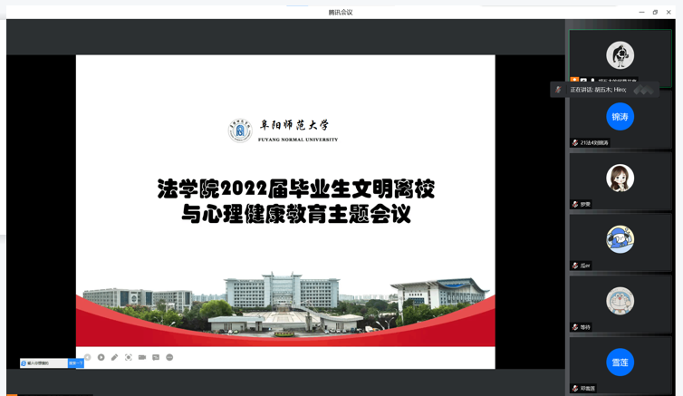 为引导2022届毕业生正确认识疫情防控形势,切实做好毕业生文明离校教育、管理和服务工作,营造健康有序、文明和谐的校园氛围,法学院于5月19日在腾讯会议召开2022届毕业生文明离校与心理健康教育主题会议。此次会议由毕业班辅导员胡五木主持,法学院党委书记钱守云、党委副书记李阳以及全体毕业生共同参加。