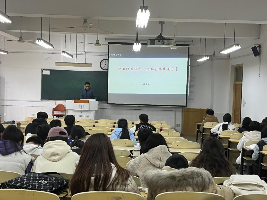 就业指导员胡五木首先指出在当前全国经济下行压力逐渐增大的背景下,大学生就业形势日渐严峻,就业压力逐年增大,建议大家要先就业再择业,在工作的过程中不断提升自己。随后,他围绕“大学生就业权利与义务”、“就业权益的法律保障”、“违约责任和争议处理”、“就业意识与自我保护”、“就业创业案例分享”五个方面逐一展开并进行讲解。