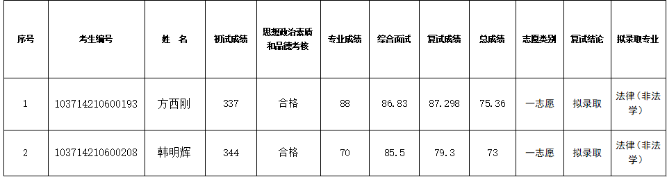 根据教育部《关于印发<2024年全国硕士研究生招生工作管理规定>的通知》(教学〔2023〕2号)、《关于做好2024年全国硕士研究生复试录取工作的通知》(教学司〔2024〕1号)和安徽省高等学校招生委员会安徽省教育厅《关于做好安徽省2024年硕士研究生复试录取工作的通知》(皖招委〔2024〕15号)等文件精神,按照安徽省2024年硕士研究生招生录取工作会议要求、阜阳师范大学法学院2024年硕士研究生复试录取工作方案。现将我院2024年法律硕士专业第一志愿全日制硕士研究生拟录取名单公示如下: