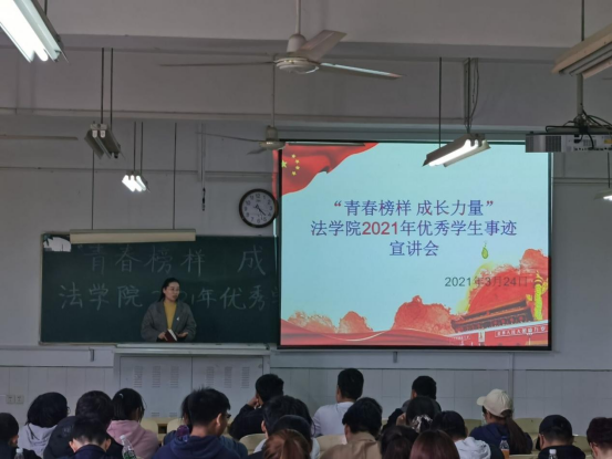 为进一步创新大学生思想政治教育形式,坚持把立德树人作为中心环节,把思想政治工作贯穿教育教学全过程,实现全程育人、全方位育人、全员育人,培育和践行社会主义核心价值观,充分发挥优秀学生榜样引领作用。3月24日,法学院在景行楼309教室举办主题为“青春榜样,成长力量”的优秀学生经验交流会,法学院党委副书记李阳、院团委负责人李阿康和法学院部分学生参加了本次活动。
