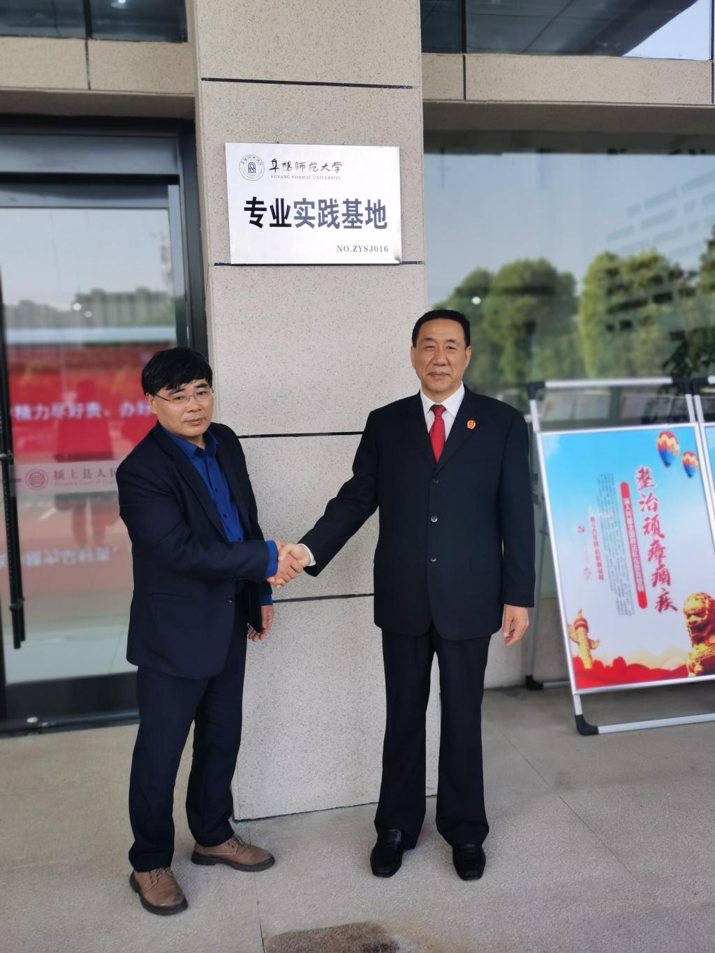李盛泉、余为青代表双方单位签订了《共建专业实习基地协议书》,并为阜阳师范大学法学院专业实践基地揭牌。