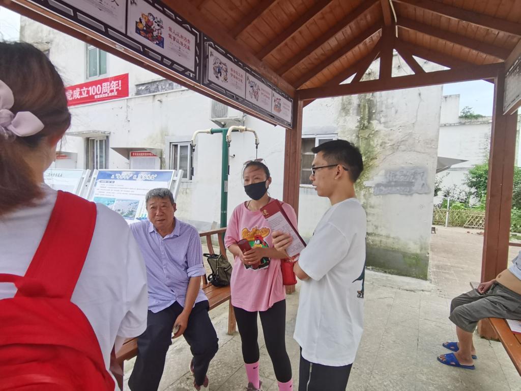 首先,团队成员先来到了阜南县曹集镇西田坡庄台,沿着习近平总书记的足迹,学习习近平总书记视察西田坡讲话精神,与村民进行了深入的交谈,并用浅显易懂的语言、耳熟能详的故事,与村民一同回顾了建党百年来,党带领全国人民艰苦奋斗,以及取得的伟大历史性成就。普法宣讲团成员通过一对一采访和发放问卷、普法宣传单的方式进行宣传,内容涵盖农村宅基地的批建与纠纷解决、消费者权益保护、交通事故处理、农民工权益保护、法律援助等实用性很强的法律知识。通过讲解当地民众身边真实的例子,剖析其中涉及的法律问题,进而帮助当地民众更加透彻地认识法律、了解法律,积极引导村民通过法律手段来维护自身权益,倡导大家一起营造浓厚的法治文化氛围。