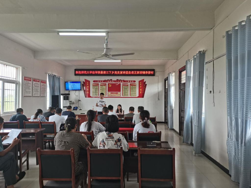 7月4日,法学院召开了2021年暑期“三下乡”社会实践动员暨安全教育大会,学院党委书记钱守云、副书记李阳出席会议,动员同学们以家乡为纽带开展社会实践活动,按照就近就便、灵活多样的原则,结合学院特色深入基层,培养创新意识、创新能力,在实践中成长,在奉献中提升。同时牢固树立安全第一的意识,在保证自身安全的前提下以吃苦耐劳的精神认真完成实践任务。7月12日-14日,法学院党史学习教育宣讲团和普法宣讲团在学院分团委负责人李阿康和项亚萍老师的带领下前往阜南县开展“三下乡”实践活动,师生深入基层和群众,访谈先进人物、挖掘红色故事;普及法律知识,提升法治理念,在理论与实践的结合中收获成长,传承与发扬红色精神、奉献精神,为当地的法治建设贡献青年学子的一份力量。