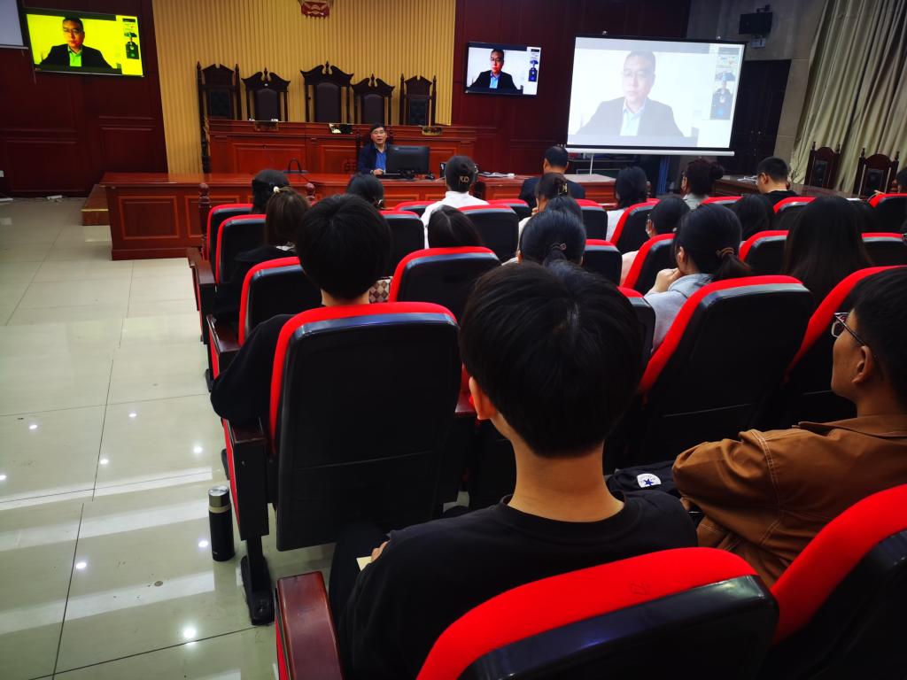 为做好升学就业指导和服务工作,全面解答同学们的考研疑惑,助力考研新征程,2023年3月9日晚上19时,阜阳师范大学法学院通过线上线下相结合的形式,于学院模拟法庭举行考研解析报告会。报告会邀请了兰州大学法学院副教授、硕士生导师、院长助理陈海平博士进行主讲,报告会由法学院党委副书记、院长余为青教授主持,法学院部分教师和全体学生聆听了报告。