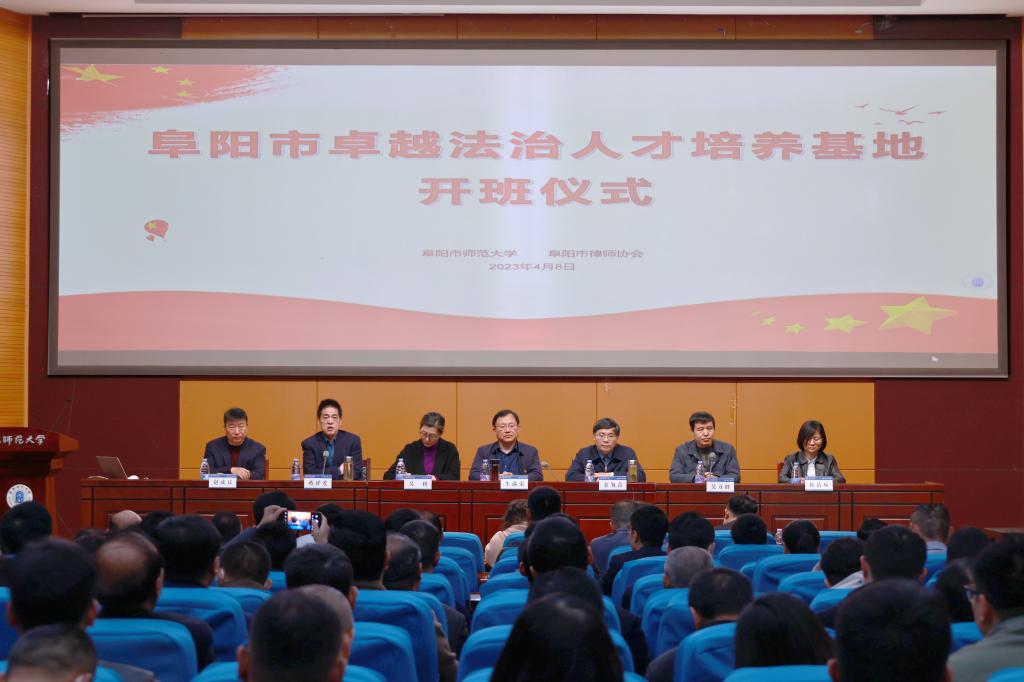 阜阳市卓越法治人才培养基地开班仪式于2023年4月8日上午在西湖校区F楼报告厅举行。阜阳市司法局二级调研员、市律师协党委书记牛满荣、法学院党委副书记、院长余为青、副院长吴万群,以及市律师行业党委委员、市律协领导班子成员,全市律师事务所负责人、党支部书记,市直律师事务所合伙人等参加了仪式。