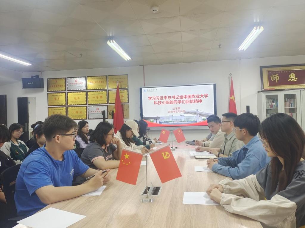 举办学习贯彻习近平总书记给中国农业大学科技小院同学们的回信精神学习研讨会。五四青年节前夕,习近平总书记给中国农业大学科技小院的同学们回信,提出殷切期望,并向全国广大青年致以节日的祝贺。5月10日,法学院举办学习贯彻习近平总书记给中国农业大学科技小院同学们的回信精神学习研讨会,法学院团委负责人李阿康、青年学生代表参加学习研讨。