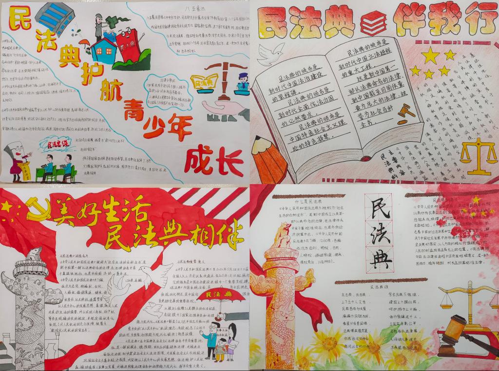 本次活动参赛选手自己动手,自主设计,创作出新颖、独特的民法典手抄报。选手们根据要求将民法典与生活紧密联系,将法典理论与实际生活等绘画到手抄报中,充分展现了民法典对美好生活的重要性。
