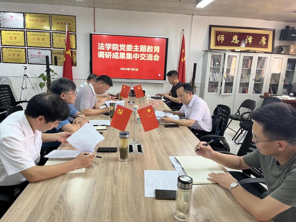 2023年7月4日下午,法学院党委在西湖校区景行楼812办公室召开学习贯彻习近平新时代中国特色社会主义思想主题教育调研成果集中交流会,校党委宣传部部长王清到会指导,学院党委班子成员参加,会议由学院党委书记马健主持。