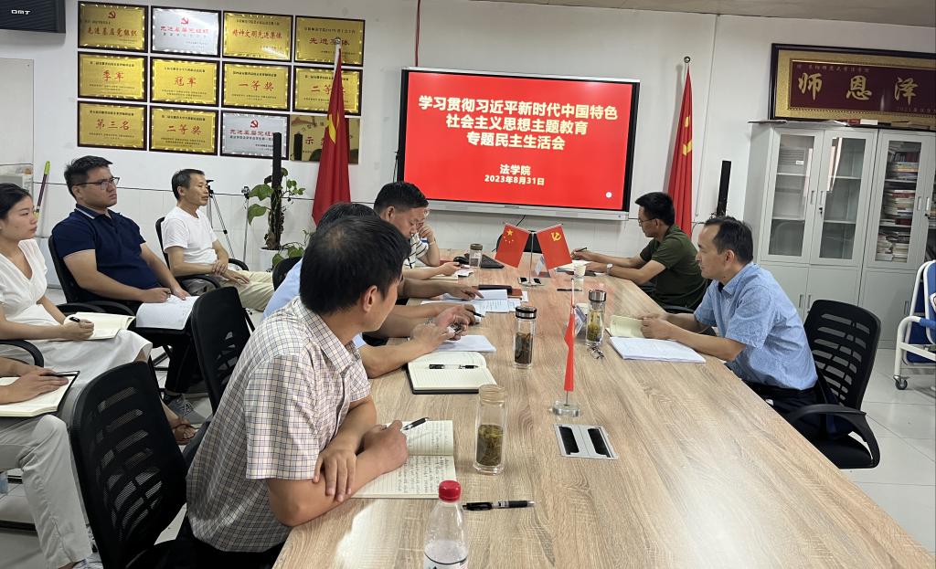 2023年8月31日下午,在西湖校区景行楼812会议室,法学院党委召开学习贯彻习近平新时代中国特色社会主义思想专题民主生活会,校主题教育第一联络组组长王清到会指导,学院领导班子成员参加会议,学院党委委员、各支部书记、专职组织员列席会议。会议由学院党委书记马健主持。