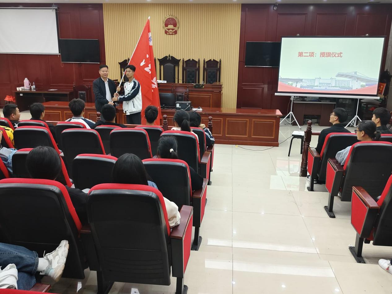 随后,马健向运动员代表团授旗。2023级法学1班学生程筠欣代表运动员发言并领誓,2023级行政管理2班学生李文馨代表志愿者发言。