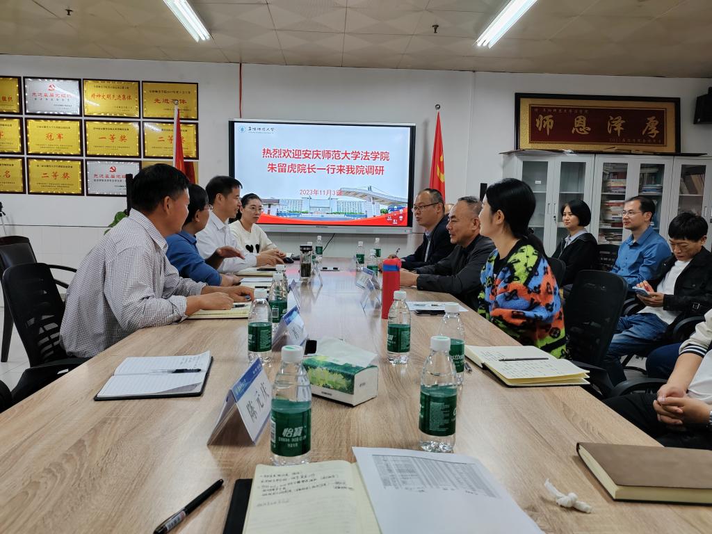 余为青对朱留虎院长一行的到来表示热烈欢迎,结合学院实际,从历史沿革、学科建设、师资队伍建设、教学科研成果等方面介绍了学院基本发展情况,特别是重点介绍了学院特色以及发展中面临的问题。朱留虎详细介绍了安庆师范大学法学院的整体情况,特别是该院今年高层次人才引进工作进步很大,令人印象深刻。随后双方就党建、学科发展、专业建设、审核评估、硕士点建设等方面进行了深入交流,双方一致认为发展中共性因素很多,差异化发展方面也各具特色,需要相互取长补短,推动共同进步。