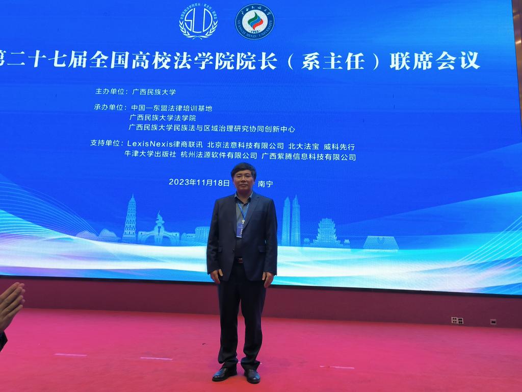 2023年11月18日至20日,第二十七届全国高校法学院院长(系主任)联席会议在广西壮族自治区南宁市召开,会议主题为“新时代法学教育与法治人才培养”。本次会议由广西民族大学主办,中国—东盟法律培训基地、广西民族大学法学院、广西民族大学民族法与区域治理研究协同创新中心承办。来自复旦大学、兰州大学、中南财经政法大学等高校法学院领导近200人参加会议。我校法学院院长余为青教授一行应邀参会。