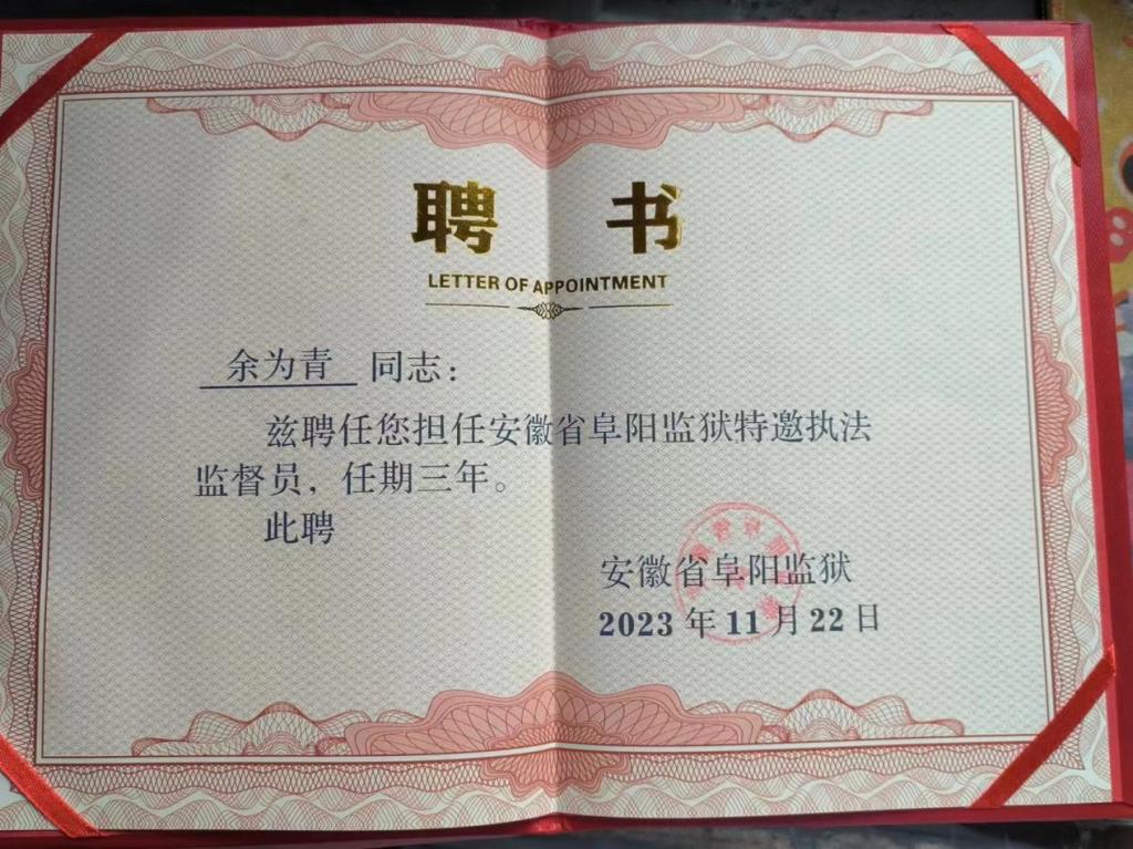 法学院院长余为青教授和龚义年教授受聘担任安徽省阜阳监狱特邀执法监督员。在聘任仪式上,余为青教授作为特邀执法监督员代表作了精彩发言,指出要充分发挥专业优势和职业优势,从人民群众关注的热点和焦点入手,做好监狱执法“监督员”,将人民群众的声音“传进来”,同时当好“宣传员”,将监狱的声音“传出去”,用心用情用力做好执法监督工作。