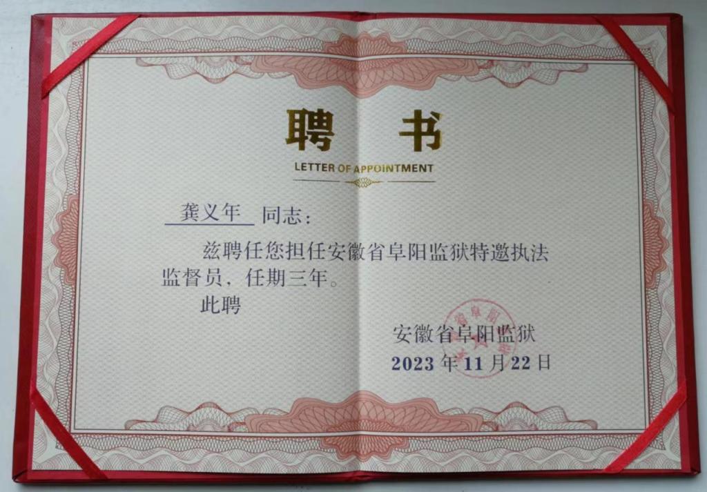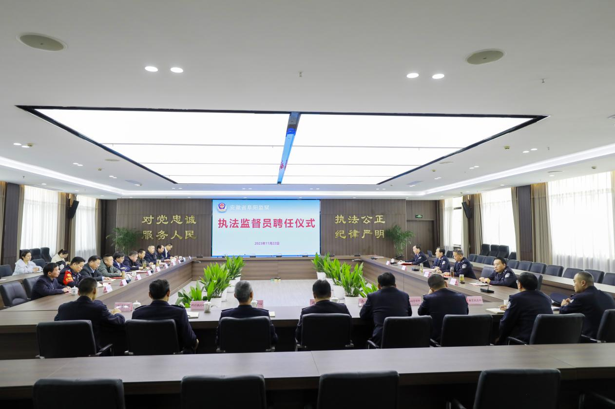 为进一步加强监狱执法规范化建设,推进狱务公开,全方位、全过程地主动接受社会监督,提升执法公信力,全面提升罪犯改造质量,2023年11月22日上午,安徽省阜阳监狱举行执法监督员聘任仪式。监狱领导刘家忠、罗瑞平、沈振、李玉君出席会议,相关业务部门负责人参会。来自阜阳师范大学、阜阳市中级人民法院、阜阳市人民检察院、安徽医科大学附属阜阳医院、阜阳市颍东区公安分局、安徽法制报、律师协会等多个政府及社会机构的12名特邀执法监督员应邀出席会议。