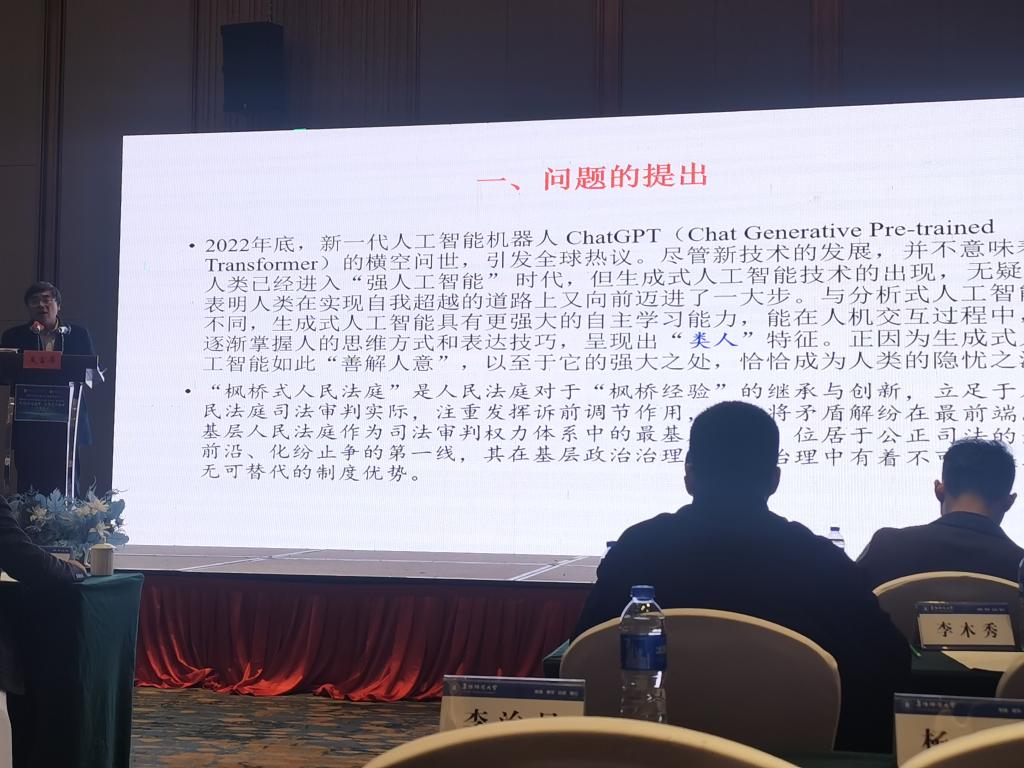 开幕式结束后,进入主旨发言环节。该环节由阜阳师范大学科研处副处长魏遥主持,安徽师范大学出版社副社长、总编辑戴兆国,中共安徽省委党校(安徽行政学院)社科部副主任李琼英分别做主旨报告。在接下来的大会报告环节,作为阜阳师范大学和法学方向获奖成果唯一代表,余为青围绕“ChatGPT赋能‘枫桥式人民法庭’建设:机遇、挑战和路径”主题,将ChatGPT在司法实践中的应用最新成果向大会做了分享。余为青通过深入浅出的解析,翔实丰富的举例,将ChatGPT类生成式人工智能在助力“枫桥式人民法庭”建设这一前沿科技法学问题生动形象地向大会做了讲解,报告赢得了现场阵阵掌声,让人意犹未尽。