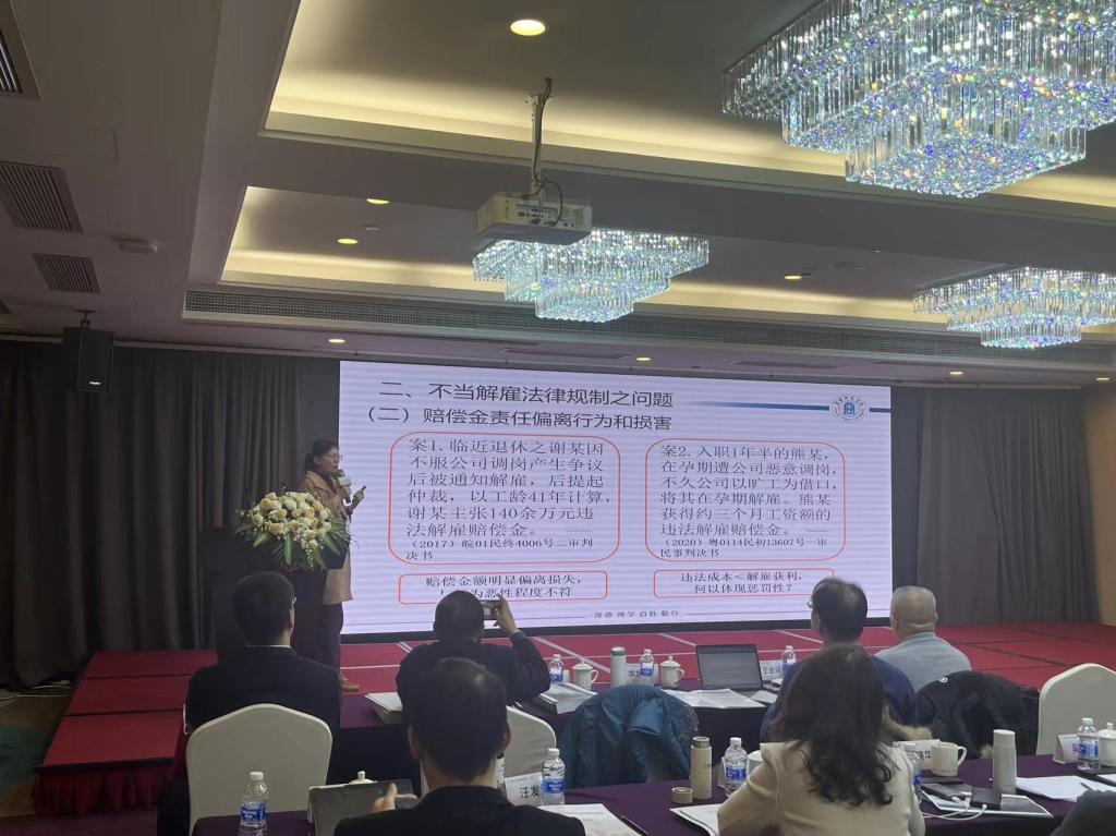 王一帆副教授在学术交流单元中以《对我国不当解雇法律规制问题的再思考》为题作了交流发言。王一帆以分析解雇保护制度的重要价值为开场,剖析了当前我国不当解雇法律规制的主要问题,并基于用工自主权与解雇保护权的平衡提出了制度完善的建议。王一帆的发言内容理论与实际相结合,不拘泥于学界共识,具有开拓性与创新性,得到了与谈专家的高度认可。