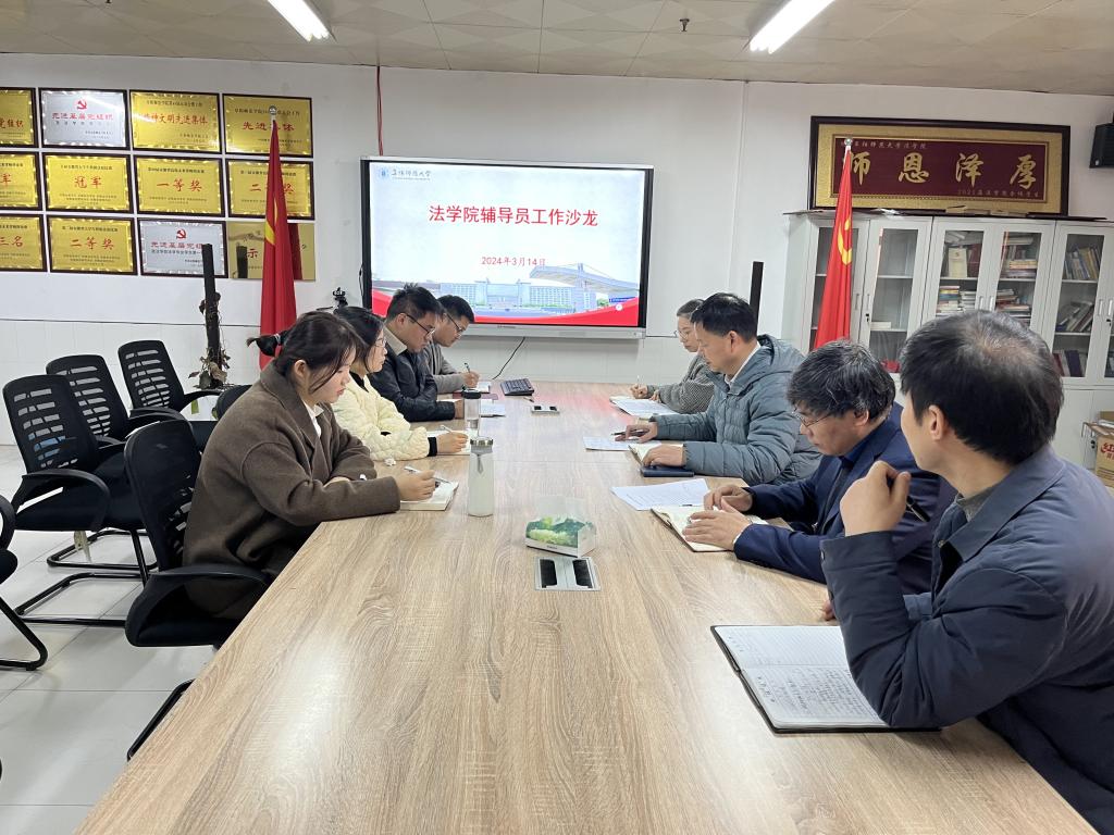 为加强培育学院优良院风学风,探索学风管理机制建设路径,推动学生实现全面发展,提升辅导员业务水平,3月14日,法学院于景行楼812会议室举办学风建设辅导员工作沙龙,法学院党委书记马健、院长余为青、党委副书记李阳、副院长吴万群及全体辅导员参加,会议由李阳主持。