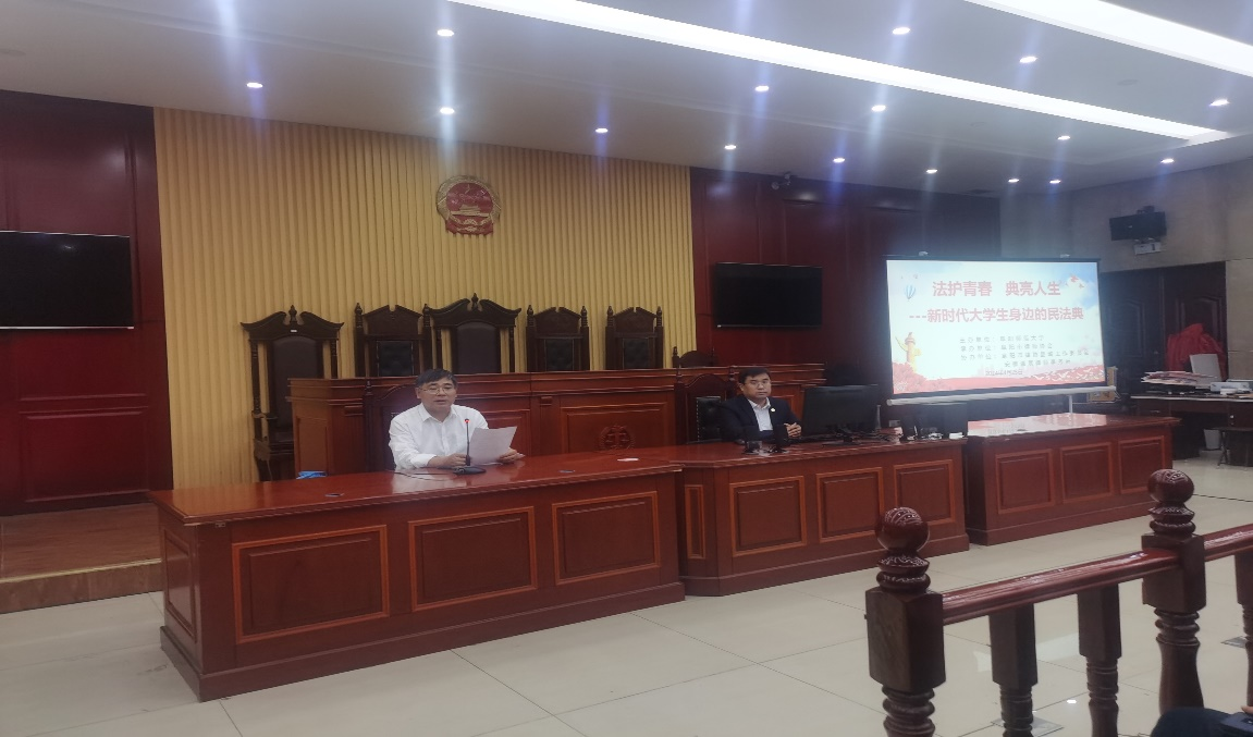 2024年4月25日下午,法学院特邀请安徽瀛展律师事务所骆东升主任,在西湖校区模拟法庭作题为:“法护青春 点亮人生——新时代大学生身边的《民法典》”的学术报告。法学院党委书记马健、民商法教研室主任陈元庆博士、苗丽博士、孔文静老师和张玲老师,2021级和2023级法科生参加聆听,报告会由法学院院长余为青教授主持。