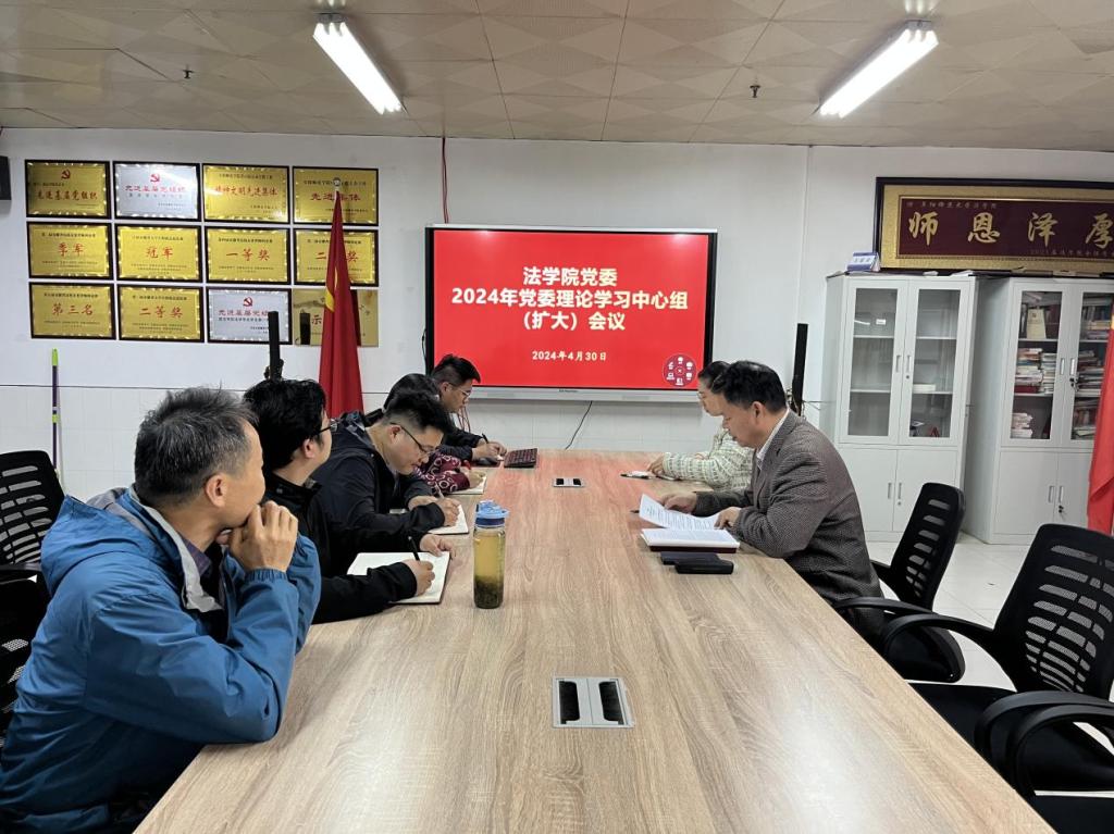 2024年4月30日上午,在西湖校区景行楼812会议室,法学院党委召开党委理论学习中心组(扩大)会议。学院领导班子成员、党委委员、各支部书记、科级干部及全体辅导员参加,会议由学院党委书记马健主持。