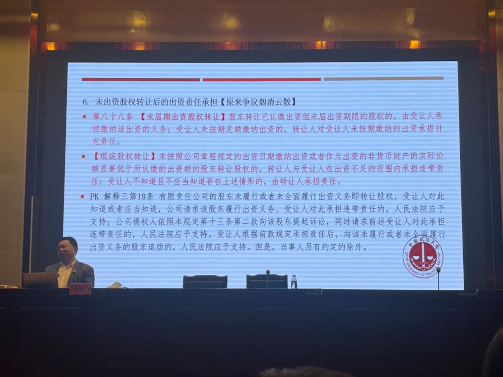 李建伟教授的专题讲座分为“公司法出台与修改历程”“公司资本、股东出资、股权结构与财务会计”“组织机构的宏观设置、职权及议事规则”“少数股东权的保护强化”“董监高任职及信义义务”等几个部分,着重分析了新《公司法》的修改内容。讲座内容既有法理的高度,又立足司法实务,内容丰富,语言生动,深入浅出,具有很强的针对性、操作性。