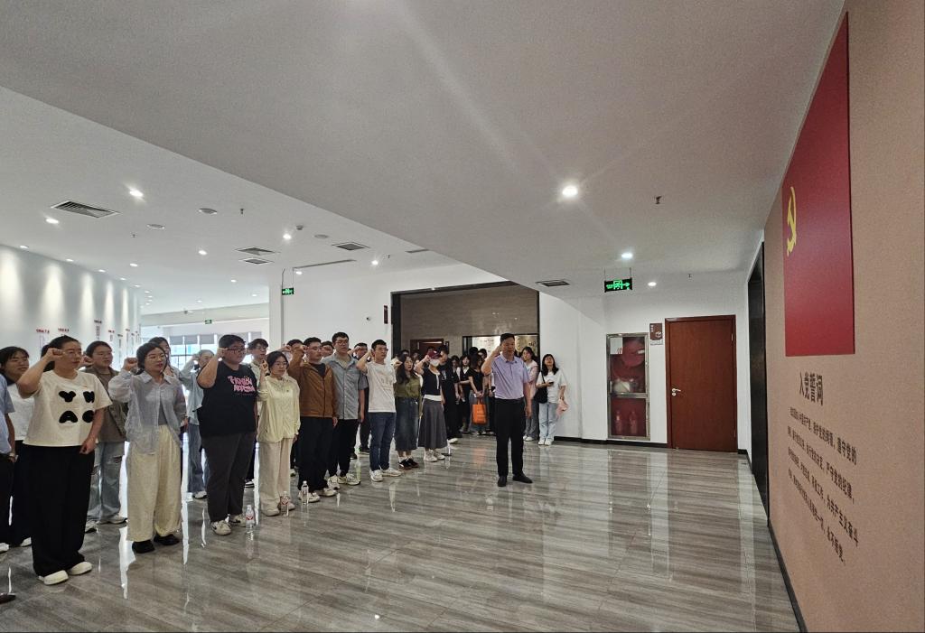 大家首先参观了王家坝抗洪纪念馆,该馆分为八个部分,以淮河治理和防汛抗洪等重大历史事件为背景,以弘扬王家坝精神为主线,展出珍贵的照片、文献、实物、影像、雕塑等资料2000余件。学院党委书记马健带领党员在馆内重温了入党誓词,鼓励在场师生代表学习和弘扬“王家坝精神”,传承优良作风,主动增强政治自觉、思想自觉、行动自觉,强化责任担当和使命意识。随后,一行人跟随习近平总书记的脚步来到王家坝闸和红亮箱包厂,观看阜南蒙洼魅力蝶变的同时感受总书记的人民情怀。