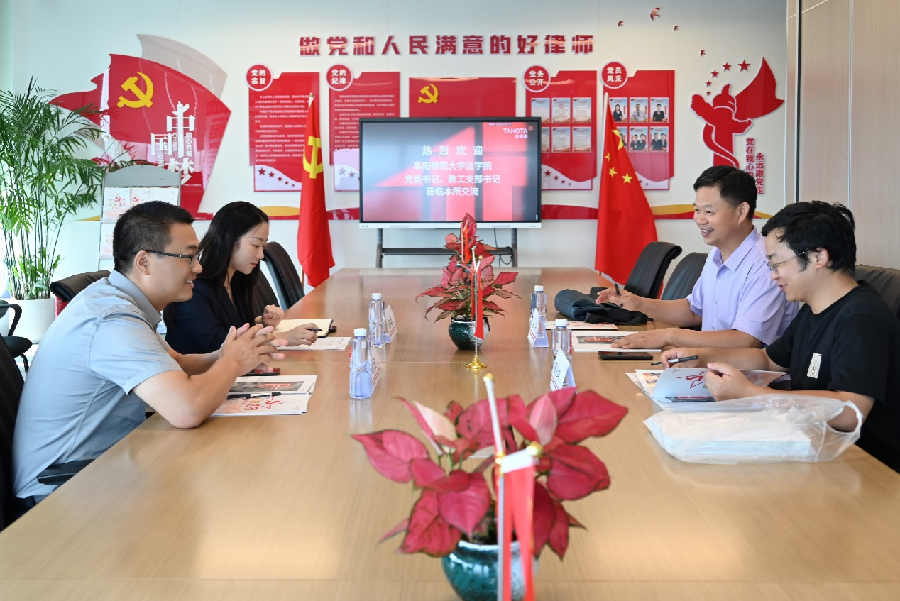 法学院党委书记马健在调研律所时,对阜阳市、阜阳师范大学、法学院进行了全面的介绍与推荐。从阜阳市的历史名人、人口大市、交通枢纽、GDP、全国卫生城市等优势,到阜阳师范大学的悠久历史、两位院士、杰出校友,再到法学院的发展迅速、博士招聘和优秀毕业生,进行了全面的介绍,引得了各律所负责人频频惊叹。他提出,欢迎各律所负责人到法学院交流,代表法学院提出希望和各律所在学生就业、实习、见习、法律人才培养以及科学研究等方面开展全方位的深度合作,积极为法学院毕业生创造更大的成长和发展空间、为各大律所输送优秀人才,为法学院和各律所的发展提供强大助力。