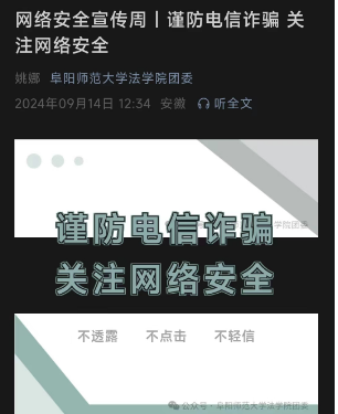 组织丰富活动,推进安全教育。根据学校相关文件和通知要求,学院积极组织动员师生观看“开学反诈第一课”和“千万师生同上一堂网络安全教育课”,参与全国大学生网络安全知识答题,参加“2024网络安全百校行”等校园主题特色活动。同时,学院结合自身实际,制定科学的活动方案,扎实组织开展网络安全知识竞赛、网络安全微视频征集、网络安全画报比赛等活动,坚持线上与线下、校内校外、课内课外有机结合,广泛开展网络安全知识宣传教育。