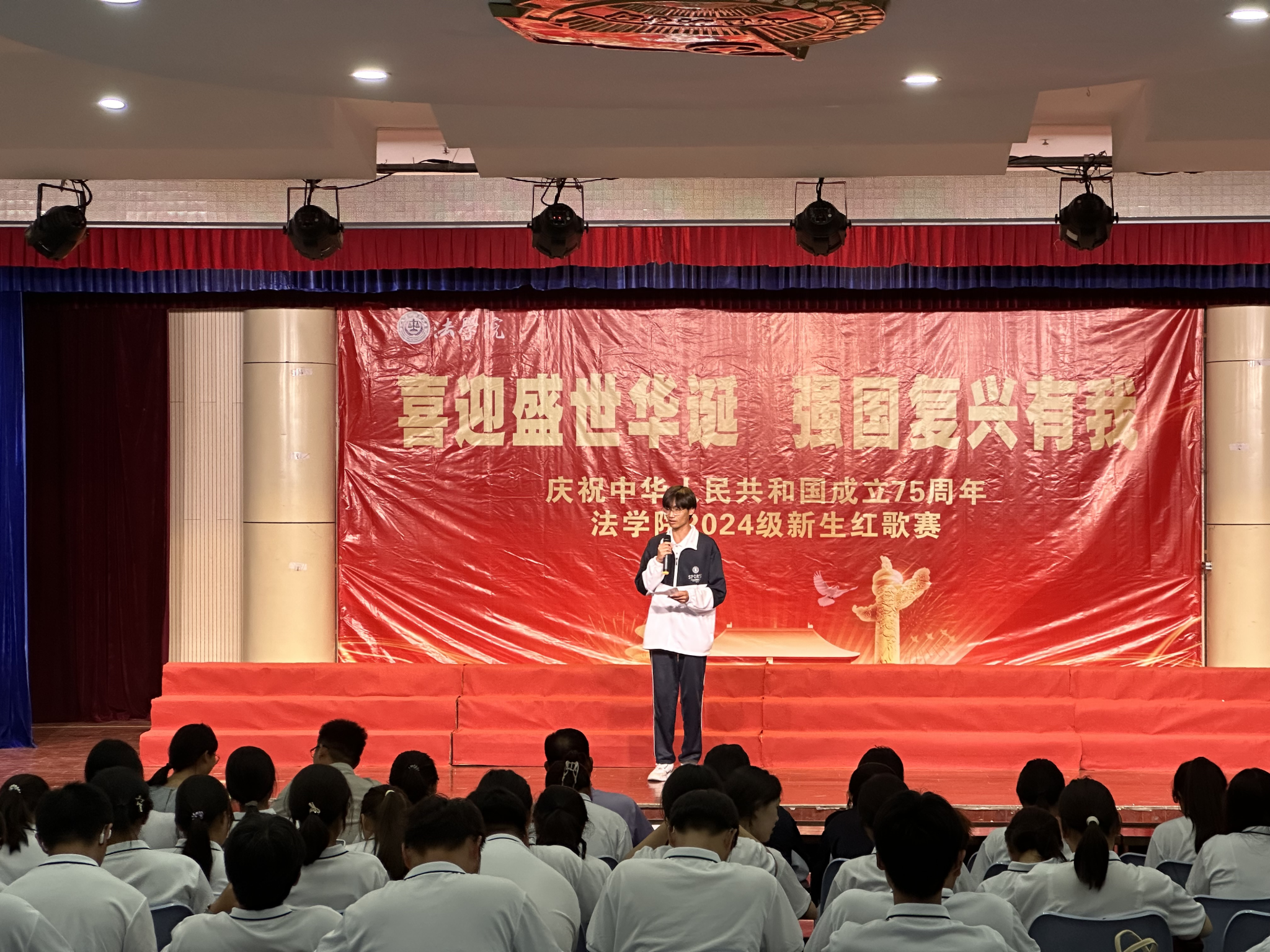 为庆祝中华人民共和国成立75周年,大力弘扬爱国主义精神,传承红色基因,赓续红色血脉,充分展现我院学子爱国爱校、蓬勃向上的青春风采,9月28日,法学院在景行楼小礼堂举办了“喜迎盛世华诞 强国复兴有我”2024级新生红歌合唱比赛,法学院党委书记马健以及法学院全体辅导员观看了比赛。