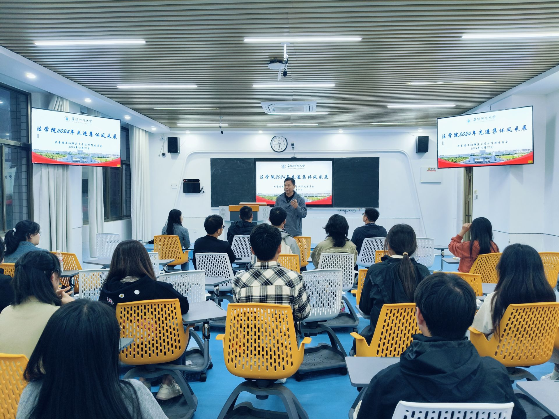 为激励班学生集体争先创优,充分发挥引领作用,同时选树典型、表彰先进、推广经验,进一步推动班团一体化和文明宿舍建设。10月31日,法学院2024年度学生先进集体风采展示大会在景行楼412召开,此次风采展示大会面向全院所有班级、宿舍开放观摩学习,以促进班级、宿舍的交流。法学院党委书记马健、副书记李阳、辅导员代表及学生代表组成评审小组,各参评班级代表、宿舍与观摩班级代表、宿舍代表一同参会,交流班团、文明宿舍建设经验。