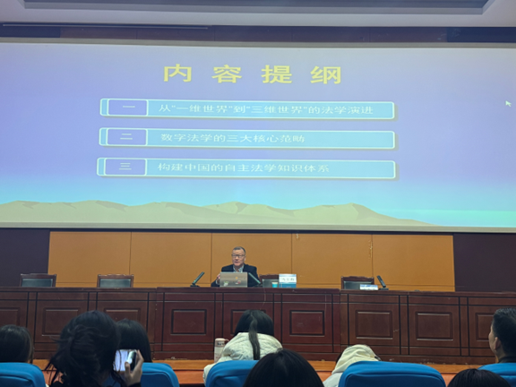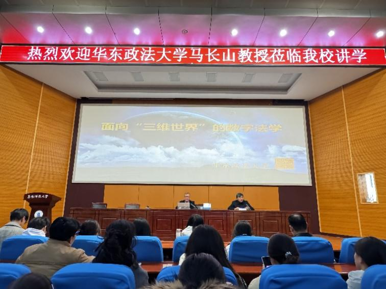 2024年11月28日上午,法学院特邀华东政法大学教授、博士生导师、华东政法大学数字法治研究院院长马长山在西湖校区躬行F楼报告厅作题为《面向“三维世界”的数字法学》学术报告。报告会由法学院院长余为青教授主持,法学院教师及全院法学专业学生聆听了讲座。