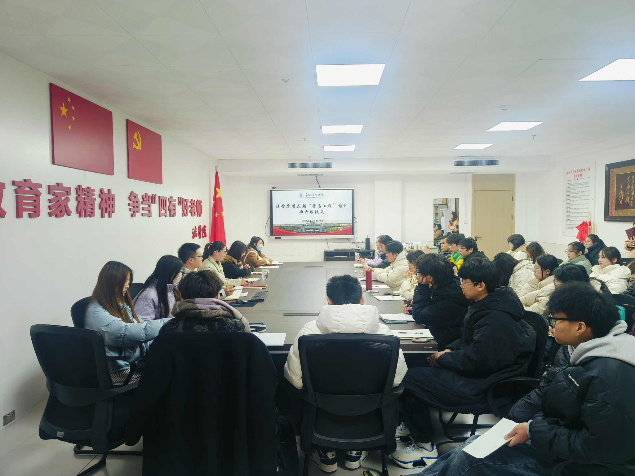 为深入学习贯彻习近平新时代中国特色社会主义思想和党的二十大、二十届三中全会精神,认真贯彻落实习近平总书记关于青年工作的重要思想,进一步加强青年学生的政治引领,着力培养坚定的青年马克思主义者。12月11日,法学院在景行楼814会议室举行2024年“青马工程”培训班开班仪式暨第一课。法学院党委副书记李阳、团委负责人李阿康及本期青马学员参加开班仪式。