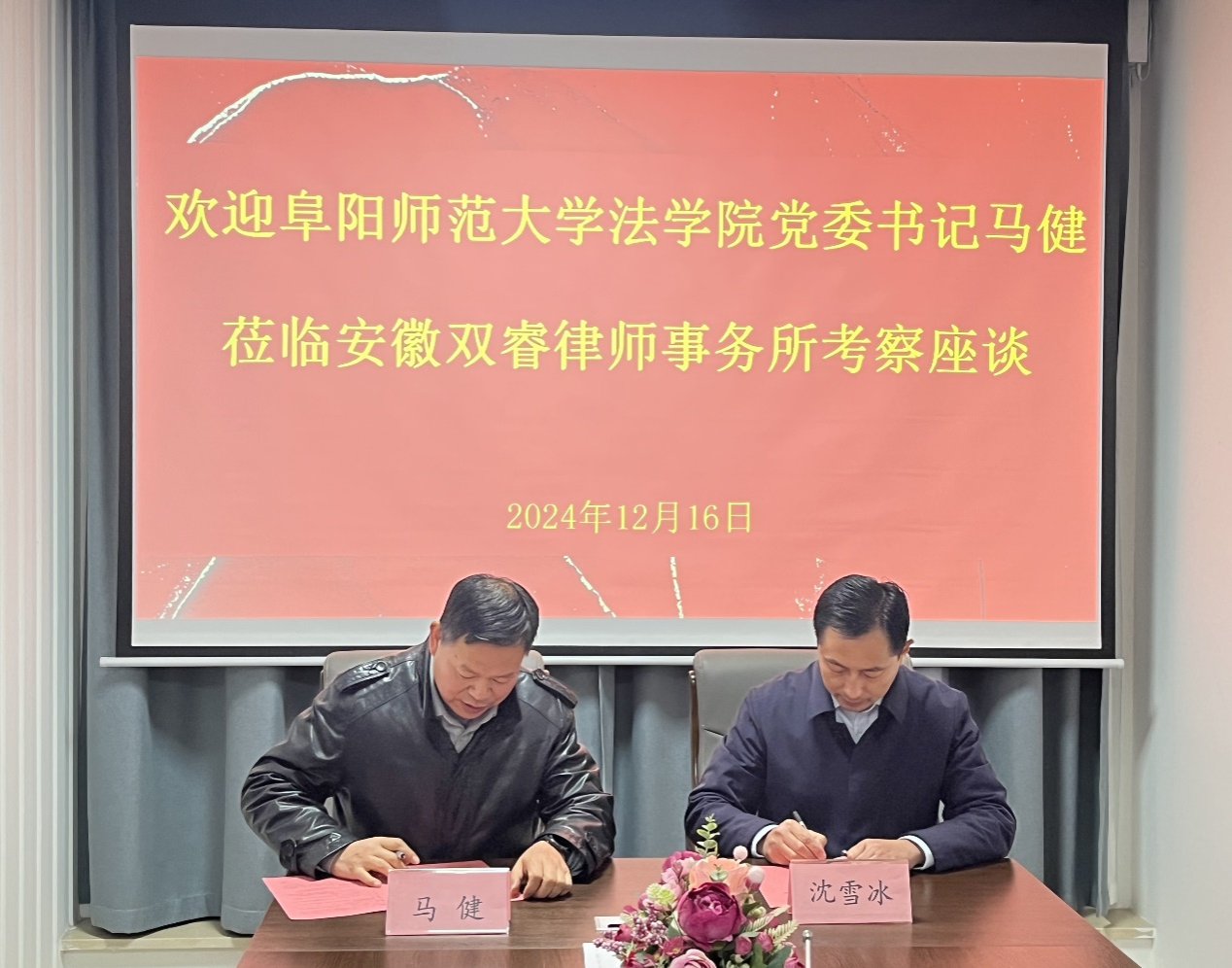 12月16日,法学院党委书记马健赴安徽双睿律师事务所访企拓岗,开展考察交流活动。安徽双睿律师事务所党支部书记、主任沈雪冰热情接待了马健,双方进行了友好的交流。