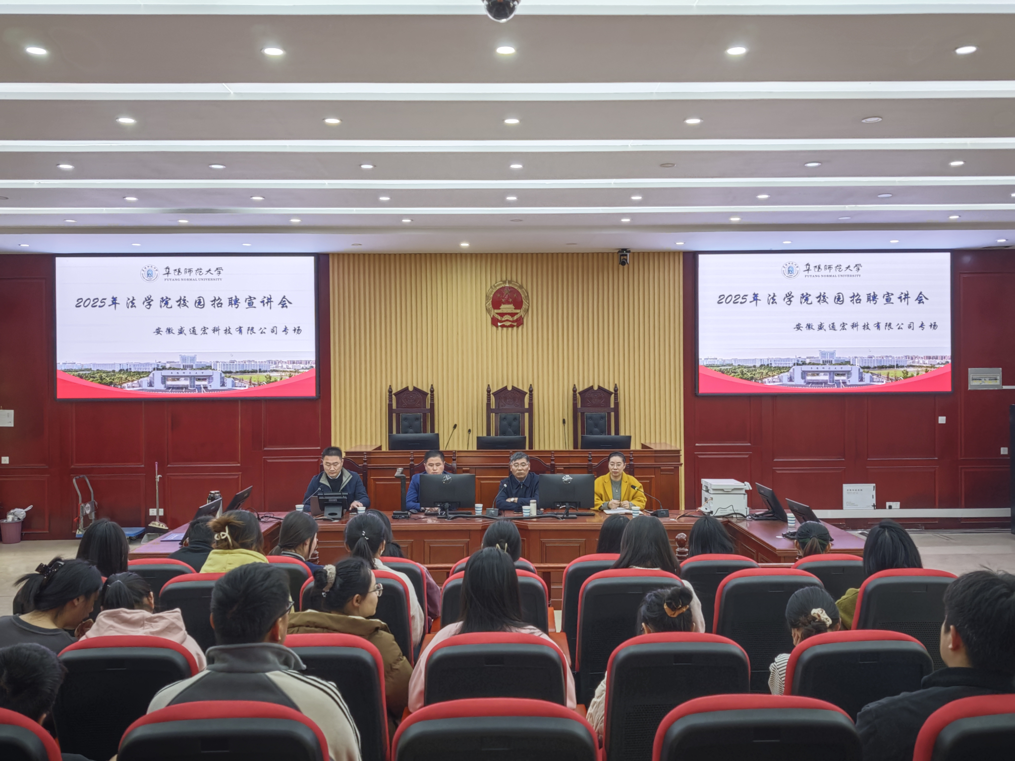 为全力推动学院毕业生就业工作顺利开展,切实搭建起毕业生与用人单位之间便捷高效的沟通桥梁,法学院邀请优秀毕业生、安徽盛通宏科技有限公司负责人燕超和刘郝龙回校举办专场招聘会。法学院院长余为青、党委副书记李阳、毕业班辅导员及来自校内外的共计100余名求职毕业生参加此次招聘会,会议由李阳主持。