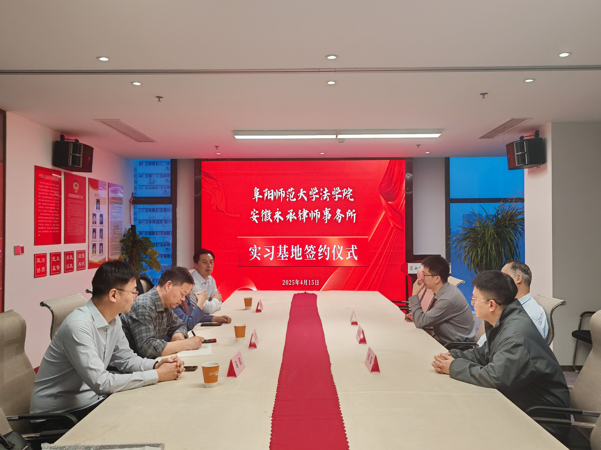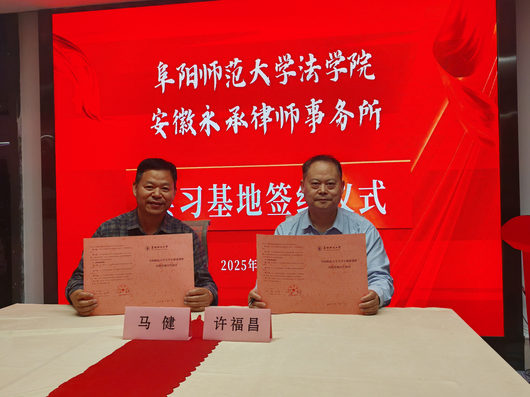 随后,双方代表正式签署《实习基地合作协议》,明确未来将在实习实训、学术研究及人才输送等方面深化合作。最后,曹冬梅主任与马健书记共同为“阜阳师范大学法学实习基地”揭牌,标志着双方合作迈入新阶段。