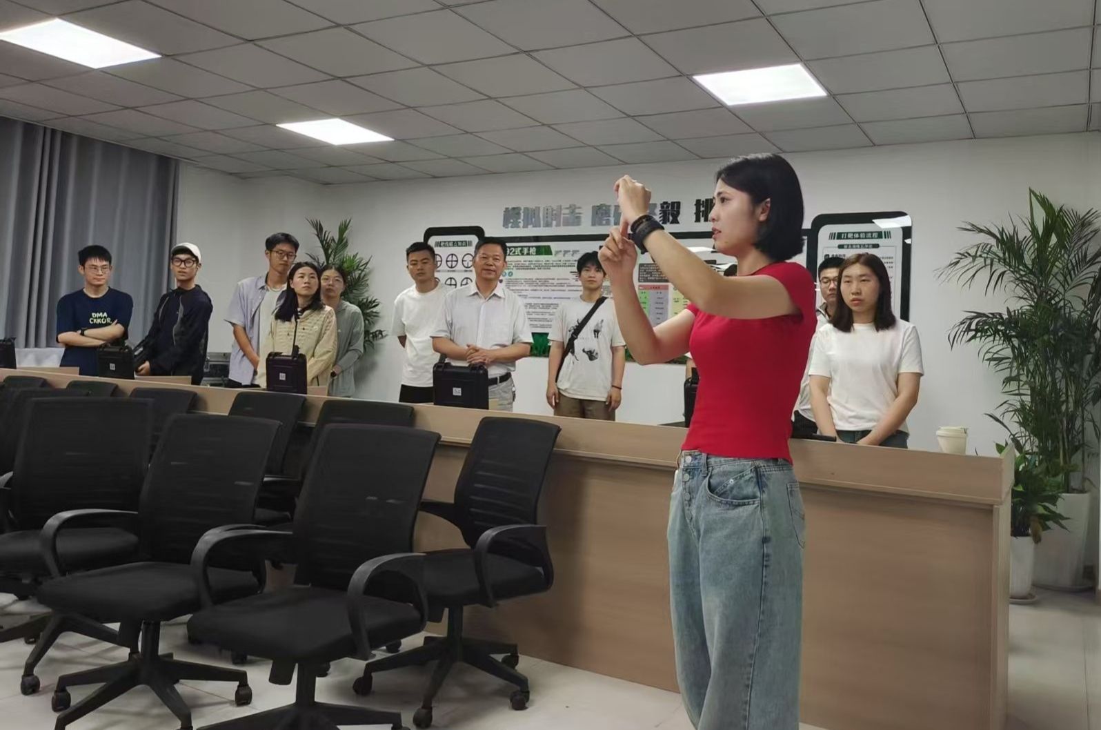 师生们在退伍大学生王子若的指导下,依次进行模拟打靶训练。“要稳,肩膀贴紧枪托;呼吸要匀,瞄准时别急着扣扳机……”况子阳半蹲着纠正研究生陈清源的姿势,“我当新兵时,为了练打靶精准度,有一个小技巧是往上瞄准一点,因为枪有后坐力,这样打到中心的几率更高。”