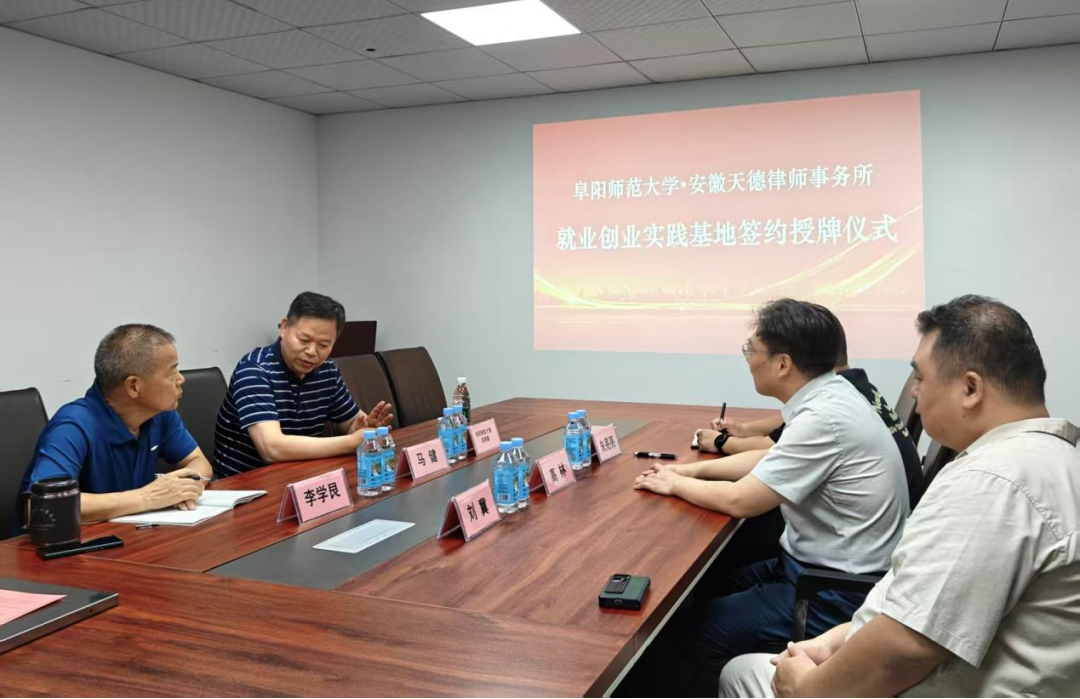 为推动法学教育与法律实务的深度融合,构建协同育人的崭新格局,6月22日,法学院党委书记马健前往安徽天德律师事务所,开展参观交流活动,并举行“就业创业实践基地”签约授牌仪式。安徽天德律师事务所主任高林、高级合伙人李学艮、管委会副主任朱亮亮、合伙人刘冀等律所管理团队成员热情接待了马健,双方就人才培养、校企合作等内容展开了深入且富有成效的研讨。