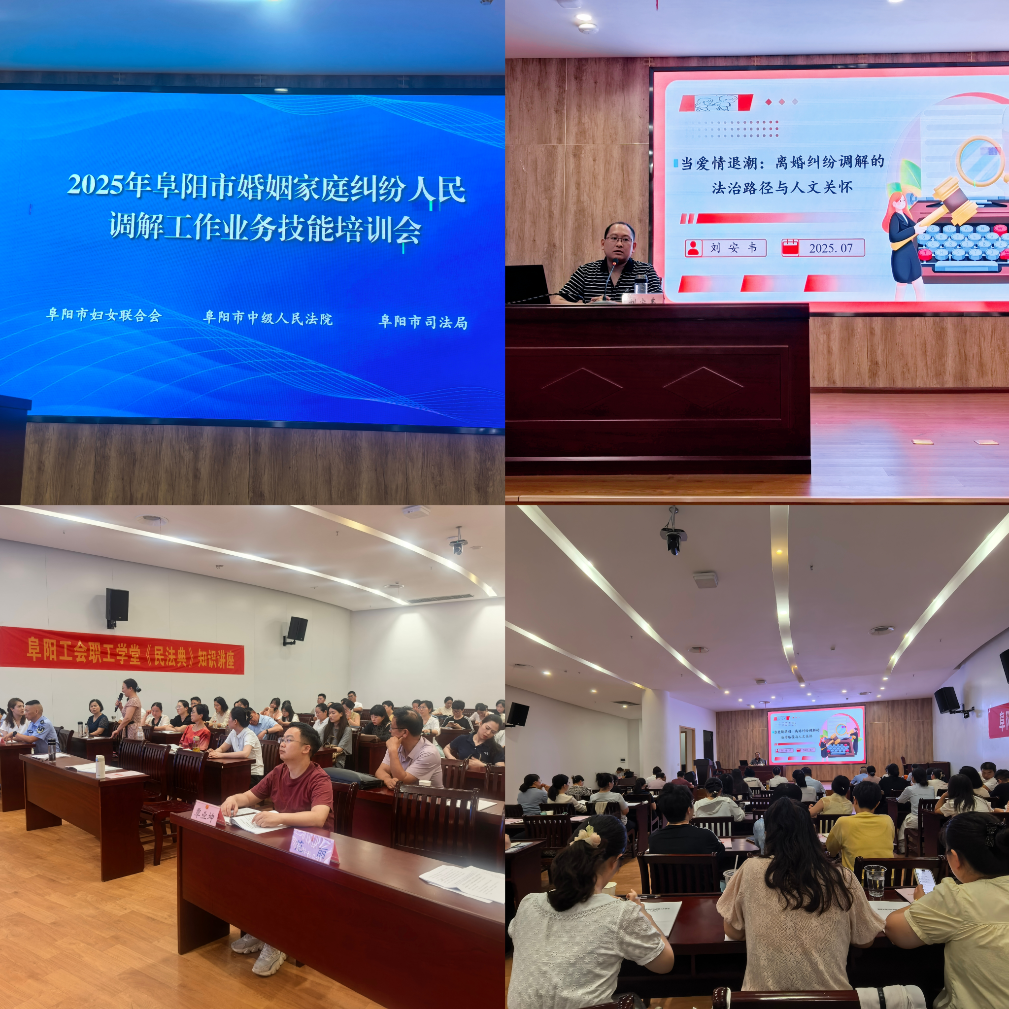 为进一步加强婚姻家庭纠纷多元化解机制建设,提升基层调解人员的法治素养与实务能力,2025年7月4日下午,阜阳市婚姻家庭纠纷人民调解工作业务技能培训会在市工人文化宫顺利召开。本次会议由阜阳市妇联、市司法局联合主办,来自各县市区的婚姻调解员代表、妇联权益干部、市女企业家协会副会长等百余人参训。法学院教师刘安韦博士应邀参会并作了题为《当爱情退潮:离婚纠纷调解的法治路径与人文关怀》的讲座,展现了高校法学教师积极参与社会治理实践、服务基层法治建设的重要担当。