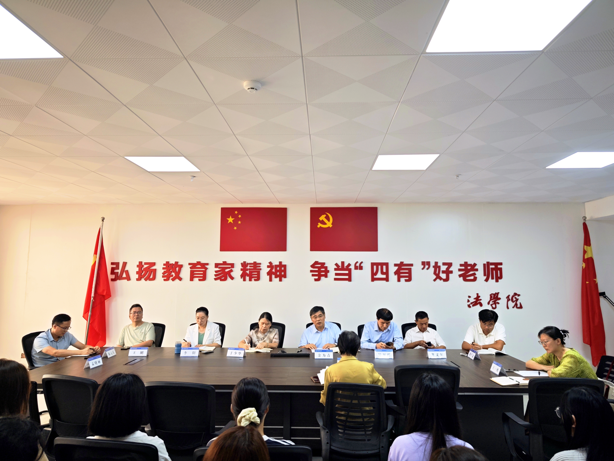 2025年9月15日下午,法学院召开了2025级法律硕士研究生师生见面会。我院党委书记于少华、院长余为青、党委副书记李阳出席会议,硕士生导师、学校政企对接合作处副处长吴万群,硕士生导师、外国语学院党委副书记王刚,硕士生导师陈元庆、李广文、龚义年、王一帆、苗丽,法学院研究生秘书刘云涛,2025级硕士生辅导员王楠,2024级硕士生代表王亚慧以及2025级全体硕士生参加会议。会议由法学院党委副书记李阳主持。
