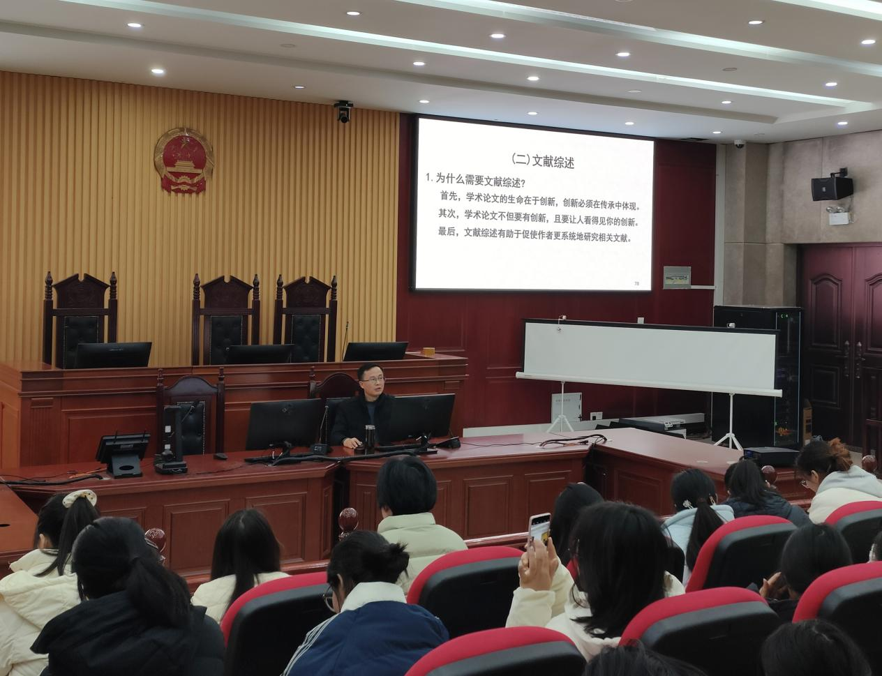 为帮助法学专业同学攻克毕业论文写作难题,强化学术规范意识,我院在景行楼模拟法庭举办毕业论文写作辅导专题讲座。讲座由法学院院长余为青教授主持,法学专业负责人、民商法教研室主任陈元庆博士主讲,2022级法学专业全体本科生到场聆听。