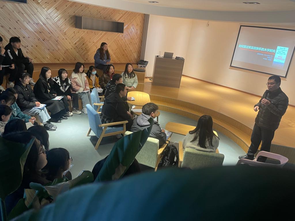 12月8日,我校在西湖校区8号楼大学生科技孵化基地举办“大学生如何度过充实且快乐的大学生活”分享交流会。创新创业学院副院长徐朝东主讲,学校30余名大学生参加。