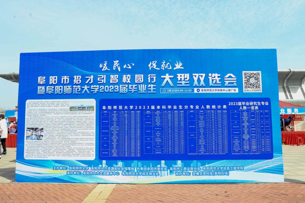 为深入贯彻党中央、国务院“稳就业”“保就业”决策部署,进一步深入开展春季促就业攻坚行动,3月25日,我校在体育中心成功举办阜阳市招才引智校园行暨阜阳师范大学2023届毕业生大型双选会。