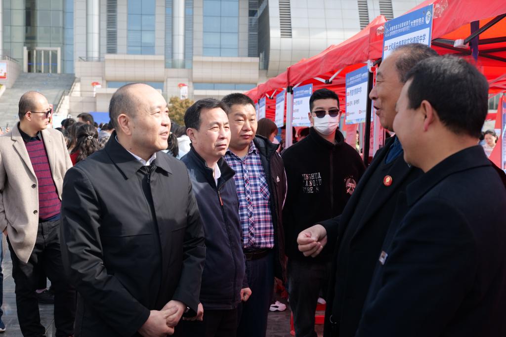 活动期间,校党委常委、副校长李文雍,安徽省大中专毕业生就业指导中心、阜阳市人力资源和社会保障局、共青团阜阳市委员会、阜阳市工商业联合会等单位相关部门领导莅临双选会现场,与用人单位和毕业生交流,了解2023年毕业生就业市场情况;李文雍详细询问了用人单位对本校毕业生的评价、校友在单位工作情况,深入了解人才市场现状和企业的招聘需求,希望用人单位能够从用人角度为学校的人才培养和教育教学改革提出宝贵建议,为毕业生就业搭建更多更好的双向选择平台。