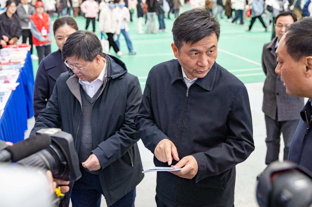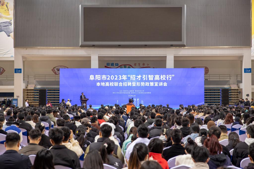 为全面贯彻落实党的二十大精神和习近平总书记关于做好新时代就业工作与人才工作的重要讲话、重要指示批示精神,深入实施人才强市战略,引导高校毕业生留阜就业创业,服务阜阳市经济社会发展,12月8日,阜阳市2023年“招才引智高校行”本地高校联合招聘暨形势政策宣讲会在我校体育中心成功举办。阜阳市委副书记、市长胡明文,我校党委书记程曦,阜阳职业技术学院党委副书记、院长郝文清,阜阳幼儿高等师范专科学校党委委员、副校长许宗志出席会议。宣讲会由我校党委常委、副校长张庆旭主持。