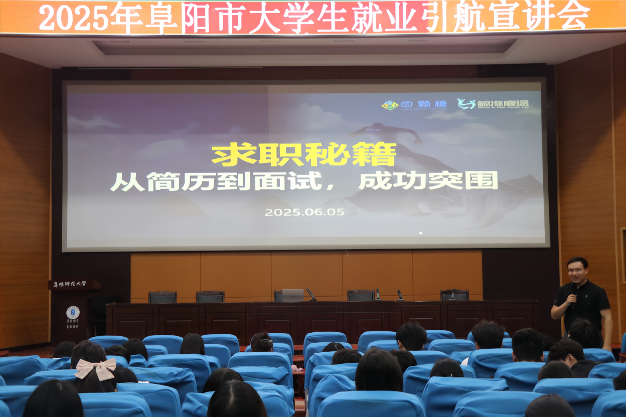 为深入学习贯彻习近平总书记关于青年工作的重要思想,落实全团促进大学生就业行动相关要求,6月5日,由团阜阳市委、阜阳市人社局、校团委主办的“颍淮扬帆,‘职’等你来”2025年阜阳市大学生就业引航计划系列活动在我校正式启动,安徽莜苡家居有限公司总经理赵兵、安徽四颗糖教育科技有限公司总经理马成龙作为就业引航导师受邀为我校学生分享就业创业经验。团市委、校团委相关负责同志参加了活动。