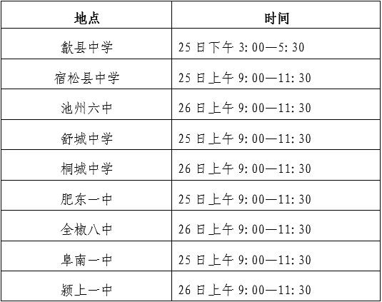 根据《安徽省教育招生考试院党总支关于组织开展系列志愿填报服务活动的通知》文件精神,为做好考生志愿填报服务工作,我校将赴安徽部分县市开展招生宣传工作,具体时间地点请见下表: