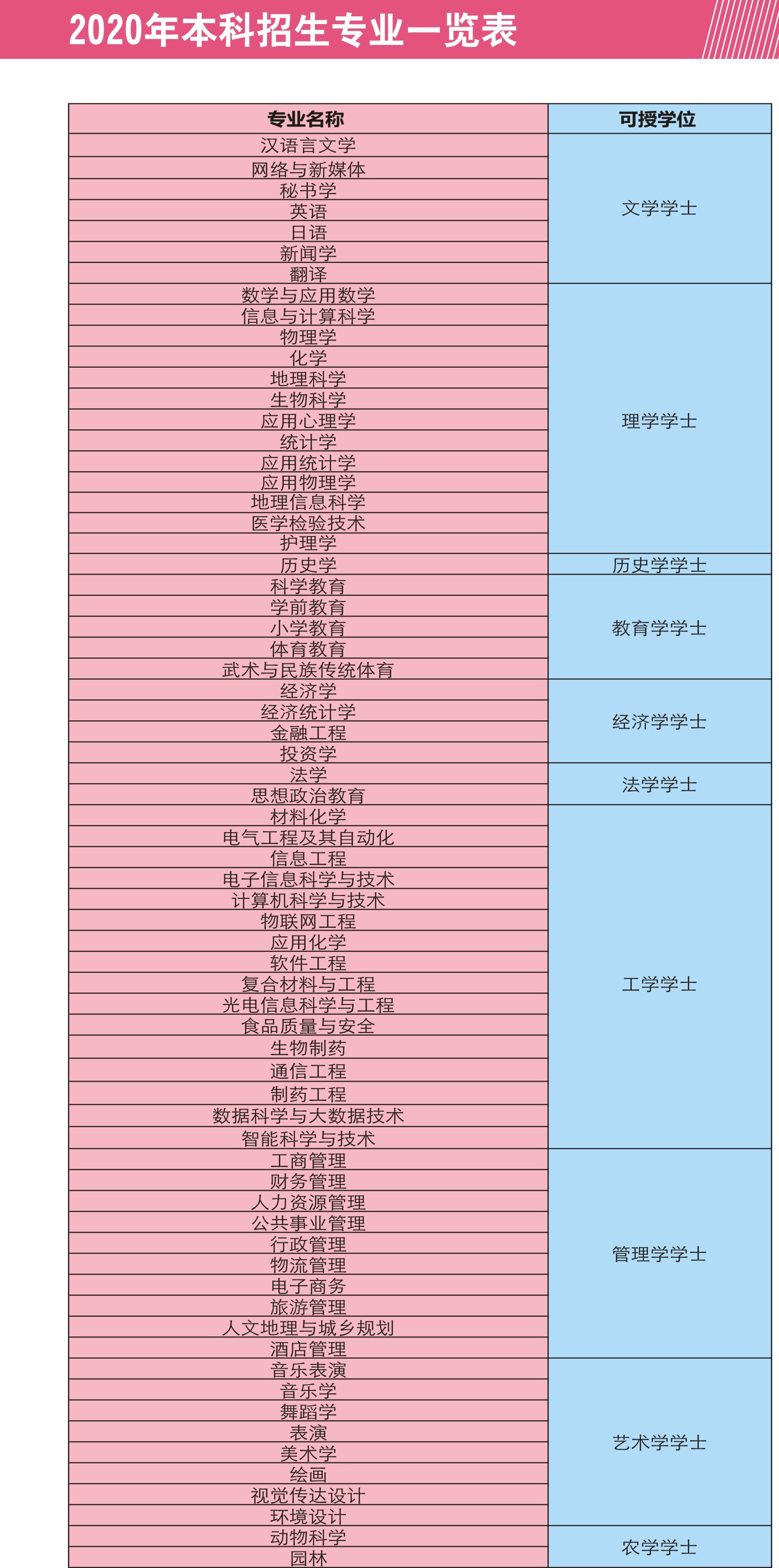 阜阳师范大学2020年招生简章(9):2020年本科招生专业一览表