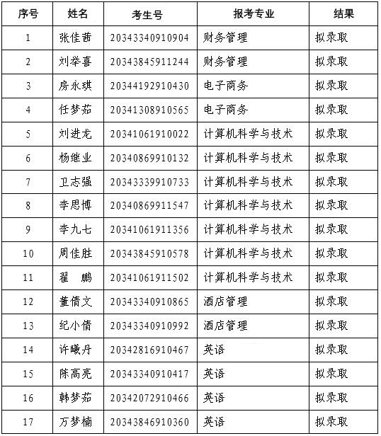 根据《阜阳师范大学2020年普通专升本招生章程》,我校于2020年6月18日上午对符合条件的考生进行了面试。面试结果经学校普通专升本招生领导小组审定后公示如下: