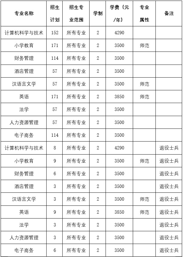 2. 录取办法:录取时,在各科目达到划定的资格线的考生中,根据招生计划数按照总分(专业课加公共课)从高分到低分排序录取,至额满为止。录取中遇到总分为平行分时,按专业课总分从高到低排序录取;总分及专业课总分仍相同时,按公共课总分从高到低录取;专业课总分和公共课总分都相同的,分别依次参照大学语文/高数、英语、专业科目1、专业科目2单科成绩从高到低排序录取;若出现若干名考生所有课程分数一致,且名次为录取考生最后一名,则按照考生提供带有学校公章的高职(专科)期间学业考试成绩作为录取参考。